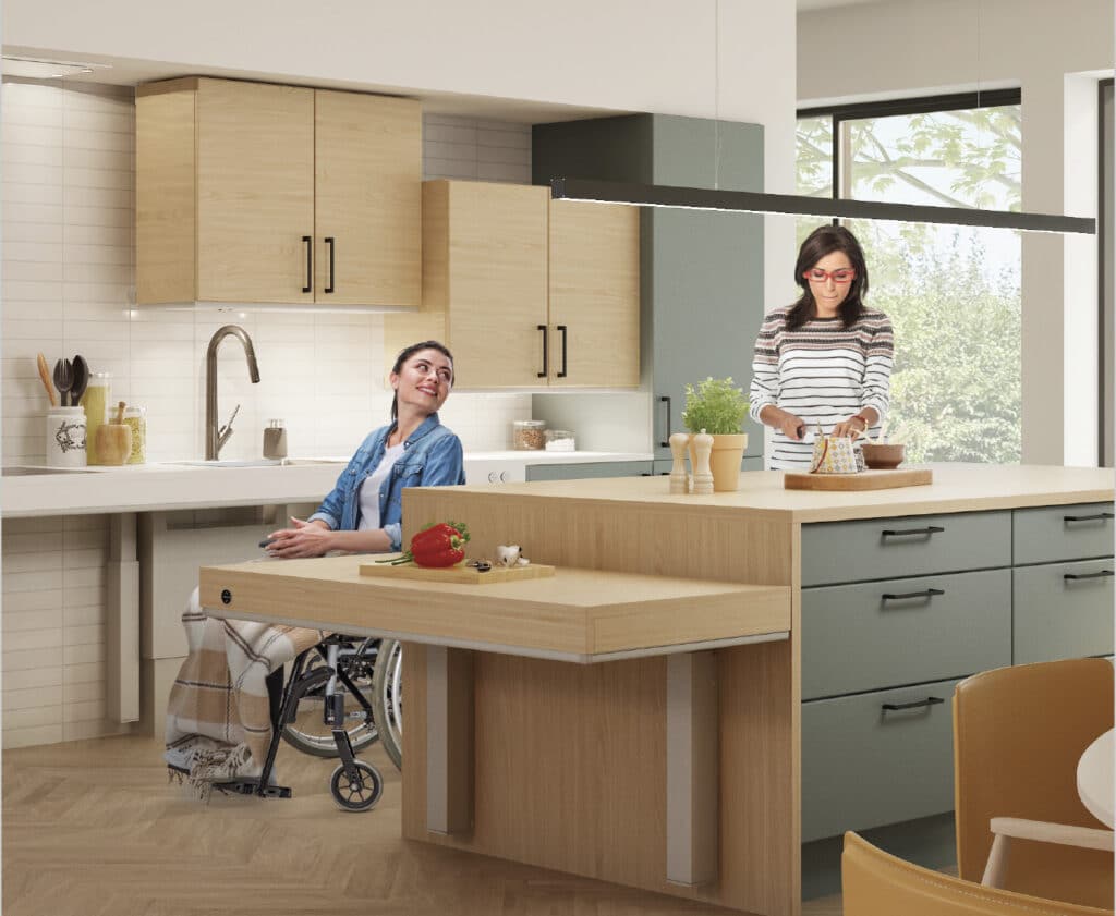 Me teemme yhteistyötä HTH Keittiöforumin kanssa, joka voi suunnitella ja toteuttaa kohteeseemme myös esteettömän keittiön tai muita säilytyskalusteita asiakkailleen. Keittiö ja muut kalusteet voidaan suunnitella siten, että niissä on huomioitu yksilölliset mitat, pyörätuolin käyttömahdollisuus, kalusteiden käytön keveys, tai muut erityiset toiminnan tarpeet. Myös kodinkoneissa voidaan huomioida esteettömyys: esimerkiksi HTH-Keittiöforumin myymän Neff-kodinkonemalliston kalusteuunin Slide&Hide® -luukku liukuu uunin alle, kun luukku avataan, jolloin uunin käyttö on helpompaa ulottuvuuden paranemisen takia.